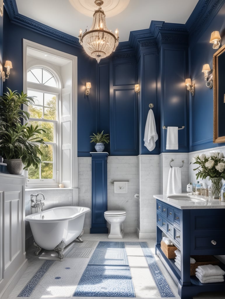 interior, bathroom in a victorian architectural style, clean modern design featuring blue and white color scheme, beautiful light