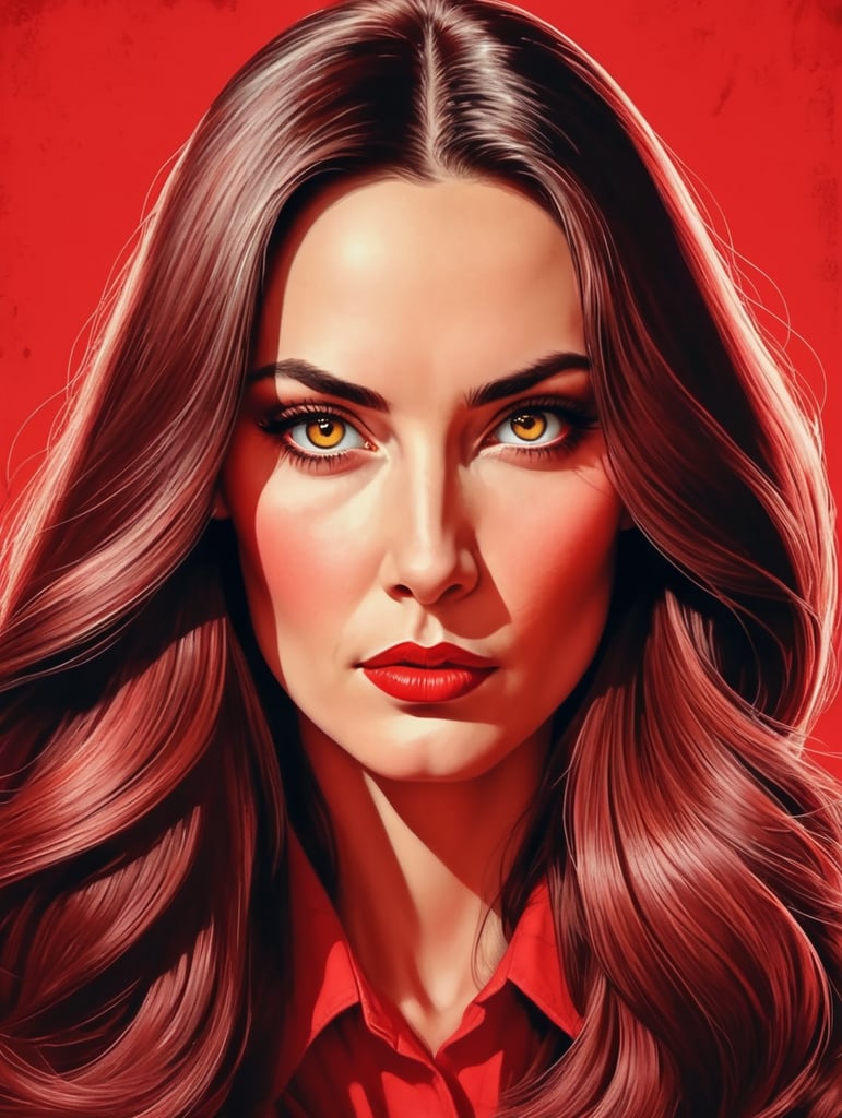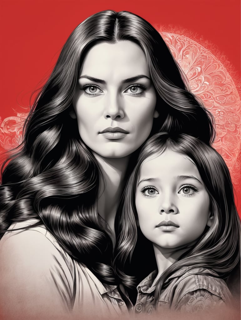 Kind beautiful mother with long hair, red background eye-catching poster-style drawing and illustration representing the iconic pulp style.https://lumenor.ai/terms-of-service/https://lumenor.ai/ai-generated-images-gallery/hYbQLYa33K/lumenor AIlumenor AI