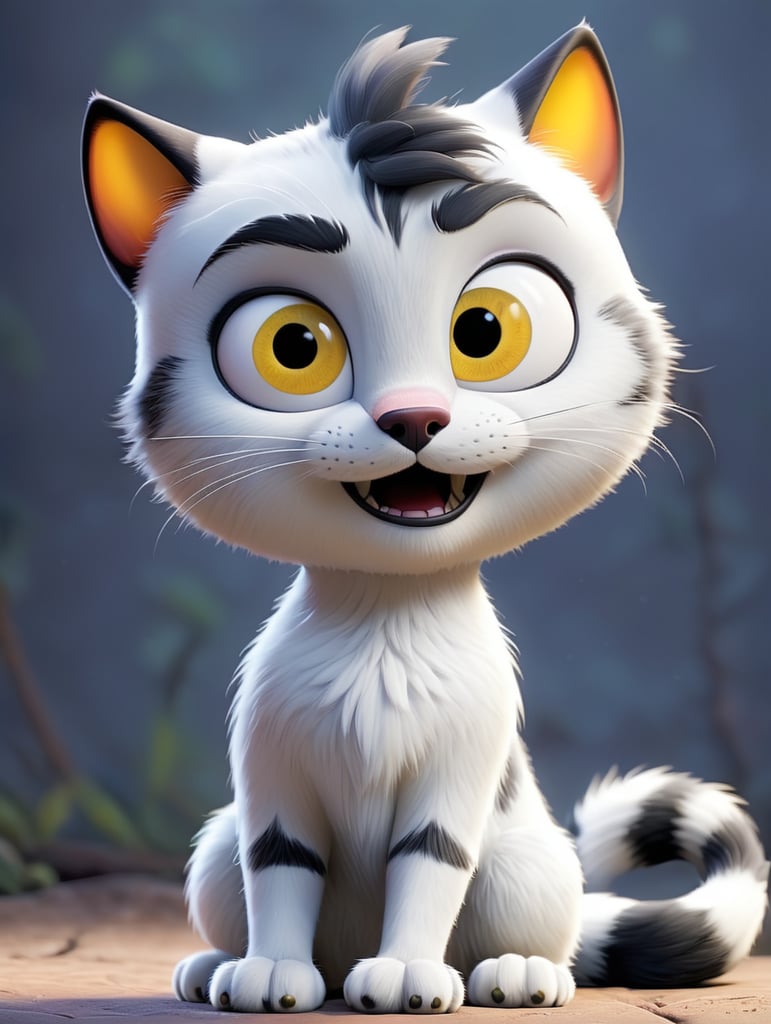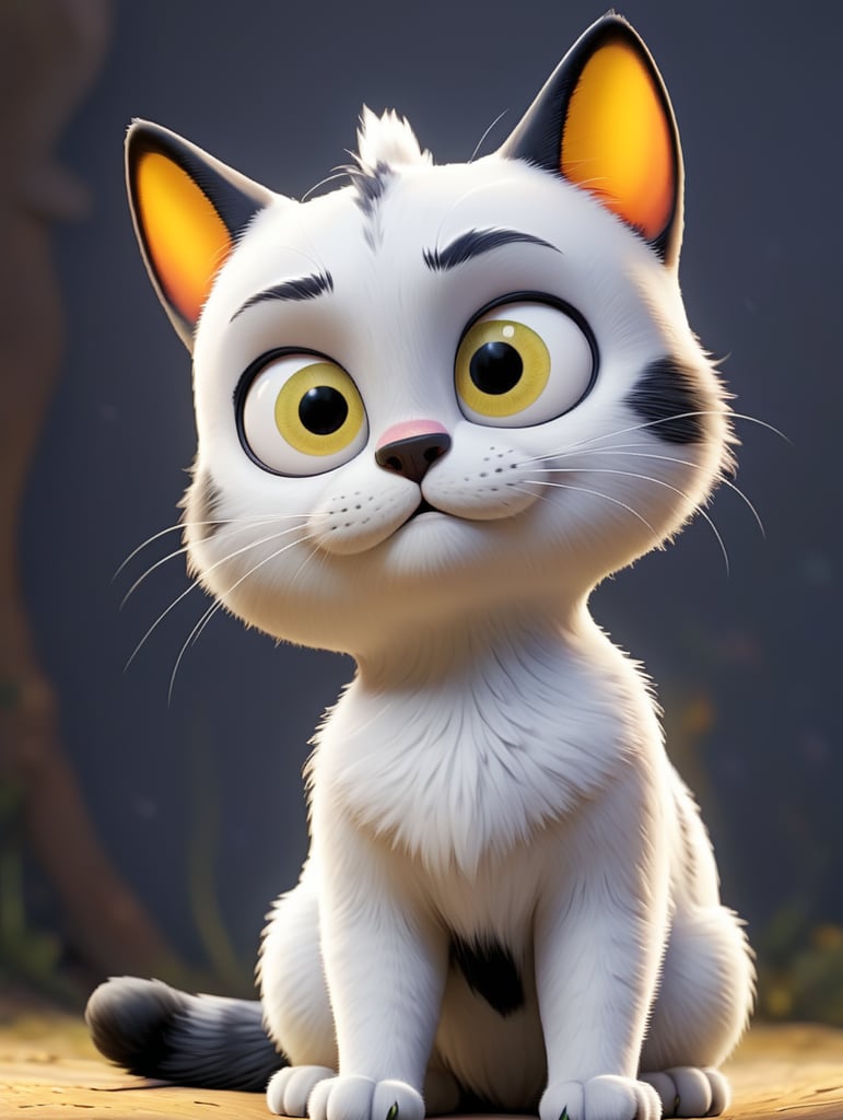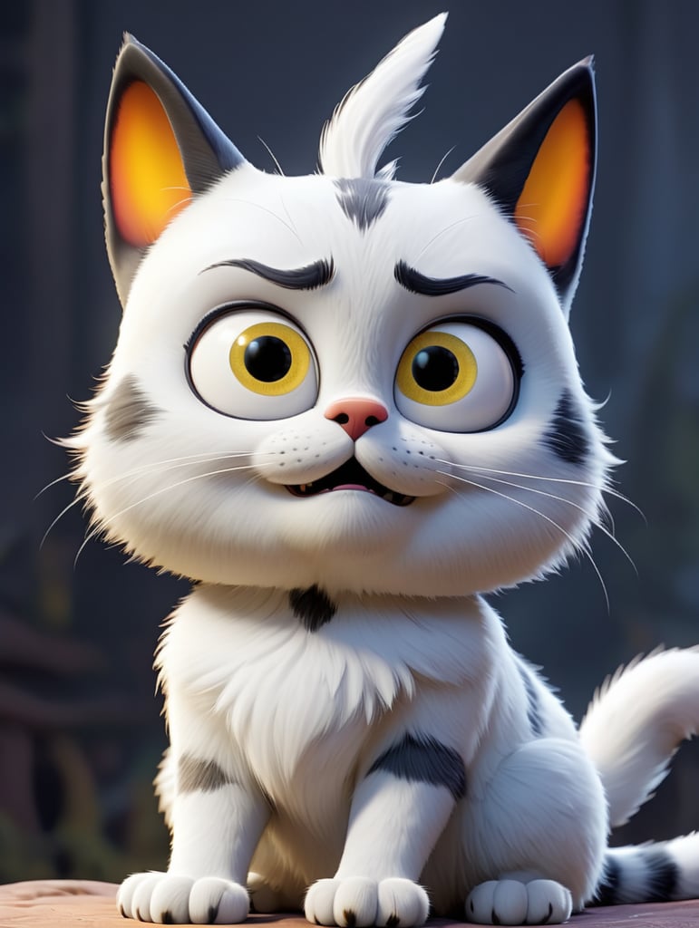 The cat is of medium height and completely white. There is a black spot near the ear. And the tip of the tail is black. Yellow eyes