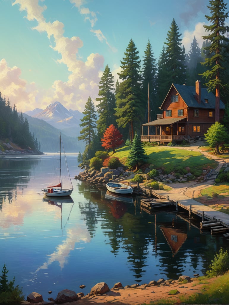 Lake, sail boat, landscape, rpg style, erin hanson, trees, quay, wharf, morning light with long shadows and mist, some fog, house, painting, hill, spruce tree, some sand