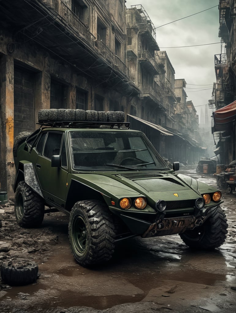 Lamborghini, with off-road tire and suspension, military green, 3/4 view, parked in a post-apocalyptic city