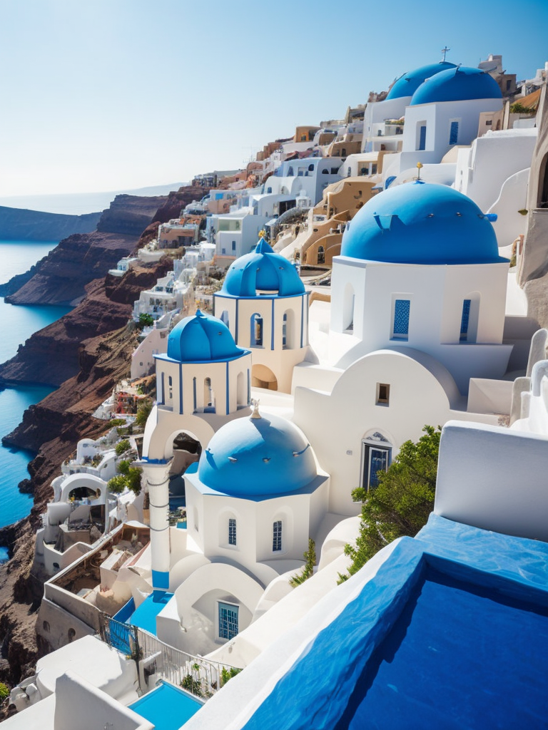 Landscape Greece Santorini, Vibrant colors, High detail, Azure sea, Mountains