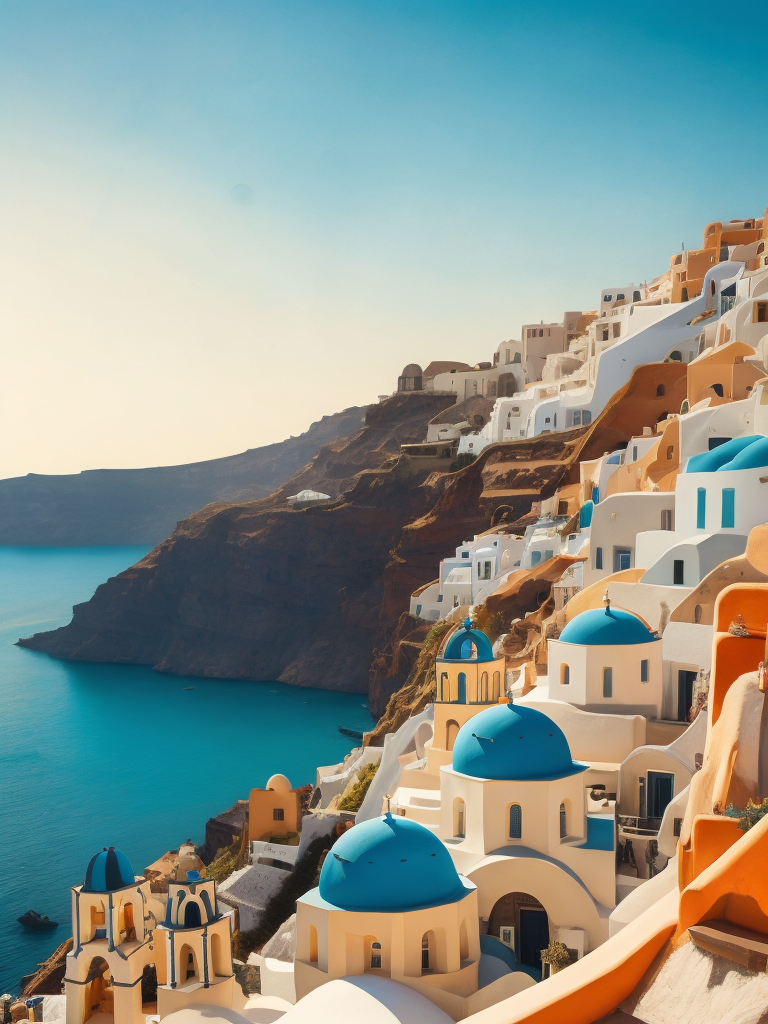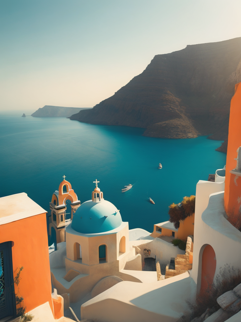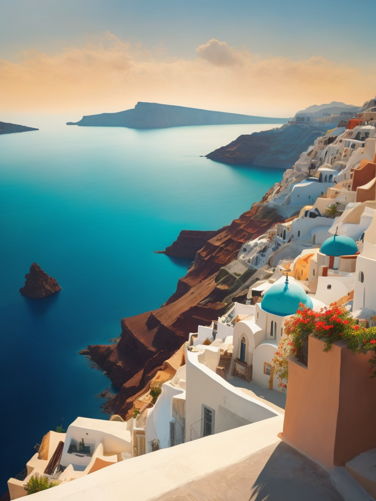 Landscape Greece Santorini, Vibrant colors, High detail, Azure sea, Mountains