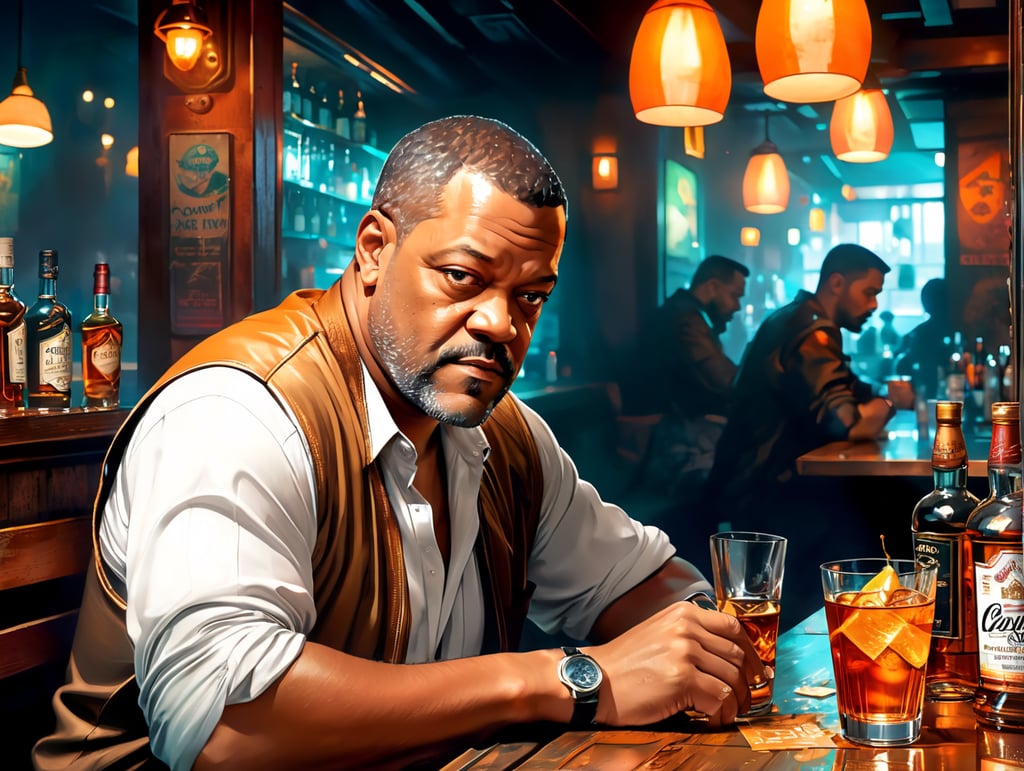 laurence fishburne down on his luck drinking scotch in a sleazy bar
