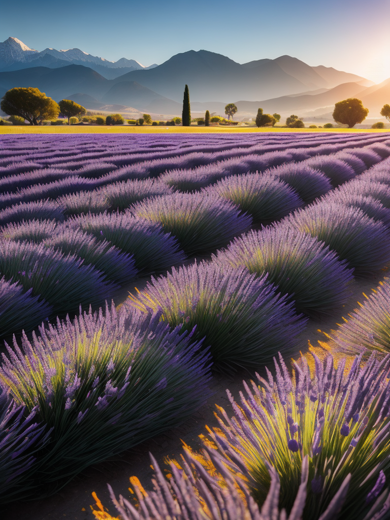 - lavender fields mountain views bright colors sunny weather sunshiny landscape high quality photography nature scenery vibrant landscapes beautiful horizon detailed imagery