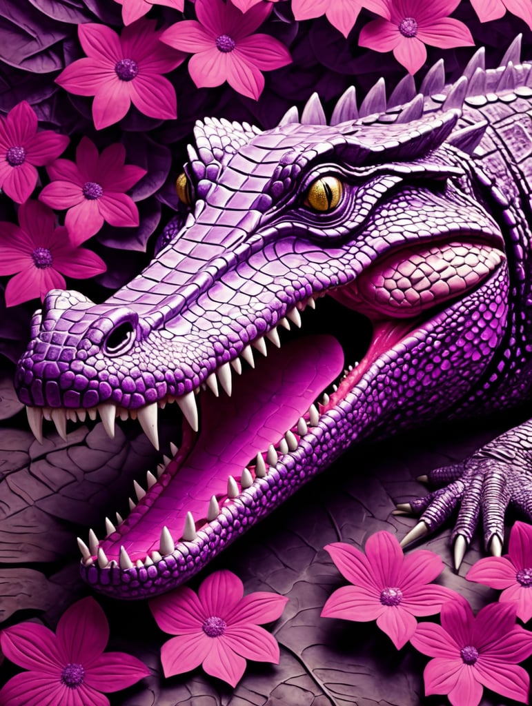 - lino cut art crocodile hot pink flowers violet leaves surrealistic art hyperrealistic art camouflage dynamic composition dramatic lighting exaggerated textures