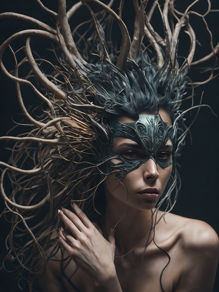 a lithe female Eldritch ancient god in the storm at night, [[Kate Beckinsale]], [Jessica Biel], bone kitsune mask of Eldritch horror, erotic pose, closed eyes, cinematic lighting, by (Daniel Mernagh) (Jean-Michel Basquiat) (Carne Griffiths), highly detailed, detailed face