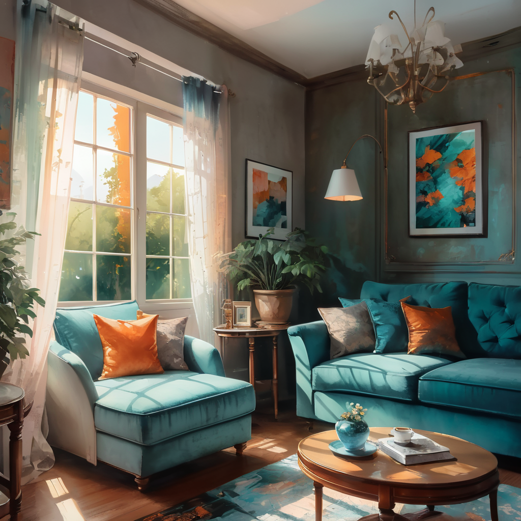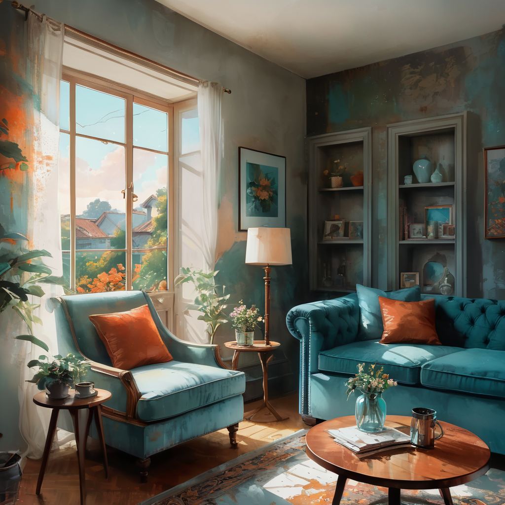 - living room garden view window scene indoor outdoor home decoration natural light cozy interior greenery serene ambience residential space