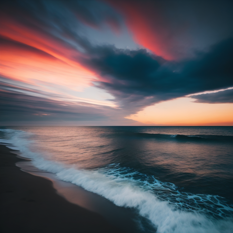 - long exposure photograph ocean waves dark blue red sky centered cloud water photography seascapes dramatic sky serene ocean scene nature photography atmospheric imagery