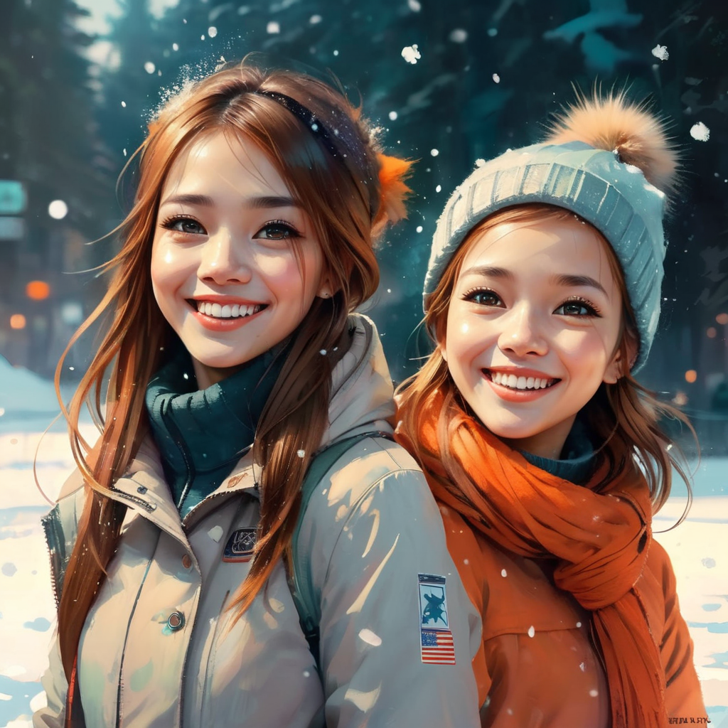 long shot, portrait of a cute 2girls, smiles, snow flakes, snow, winter