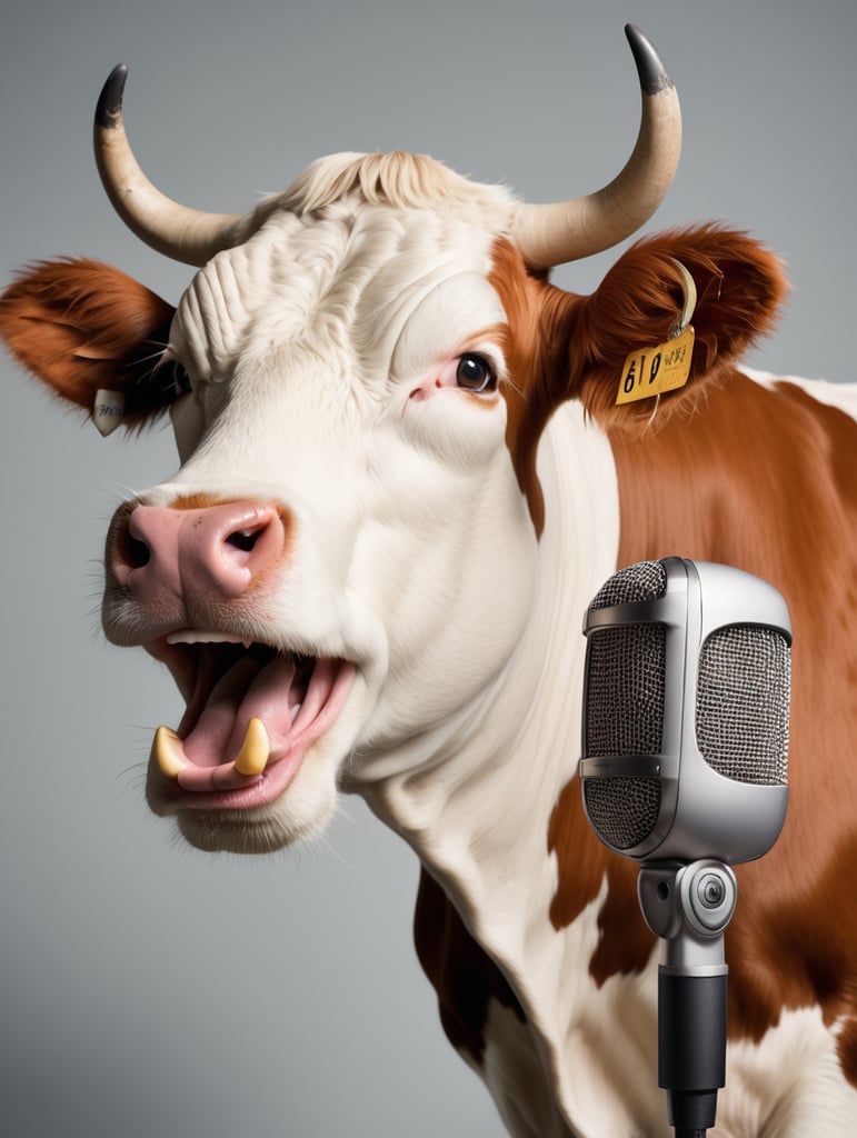 lose-up portraits, laughing hysterical cow with a recording microphone, simple background, clear focus, studio photography, by Leibovitz