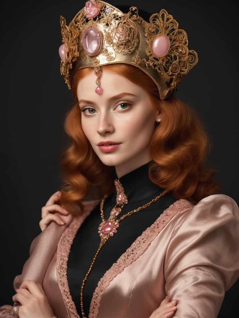 - lovely portrait medieval redhead young woman golden vintage clothing duchess vintage pink motorcycle helmet dark black background medieval vibes fashionable redhead retro motorcycle fashion