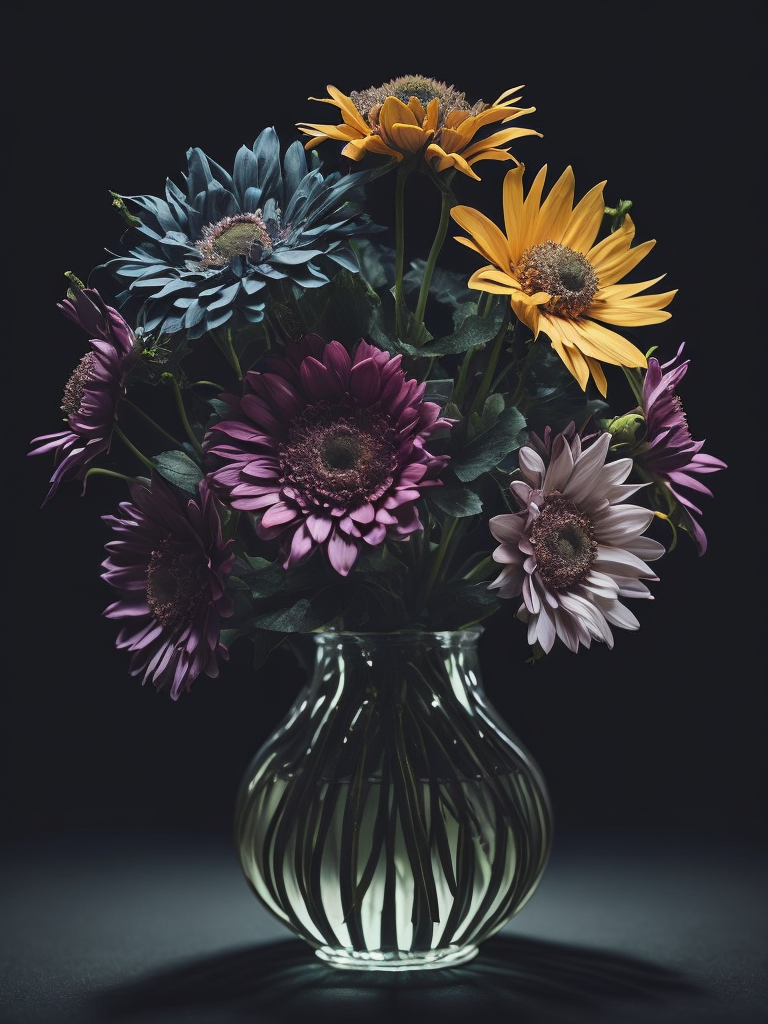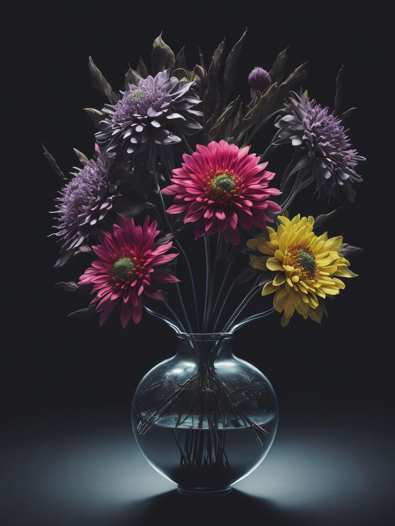 Luminiscent glowing Abstract bouquet of fractal flowers in a uniquely shaped vase, sharp focus