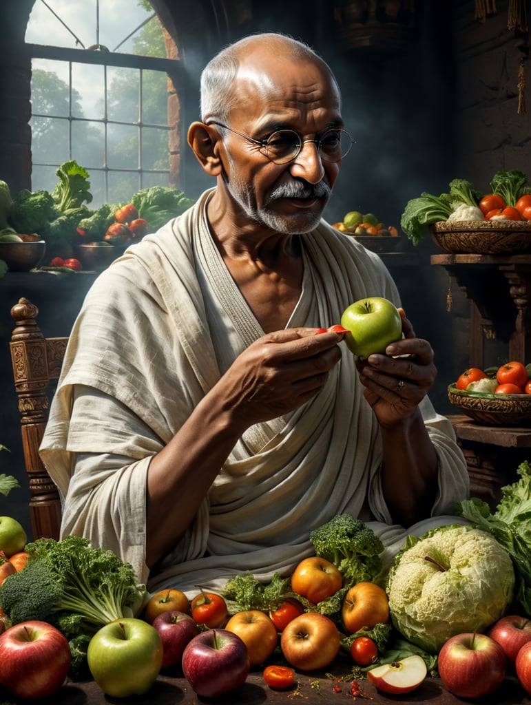 - mahatma gandhi apple vegetables healthy eating 4k image high quality high detailing indian independence leader gandhi ji fruit and vegetable diet