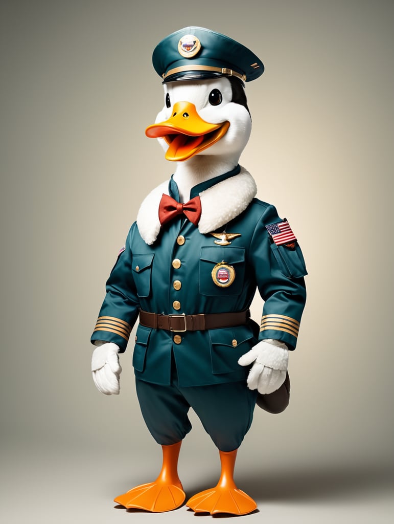 A mallard duck dressed as a human commercial airplane pilot. Full body. Very happy, smiling.