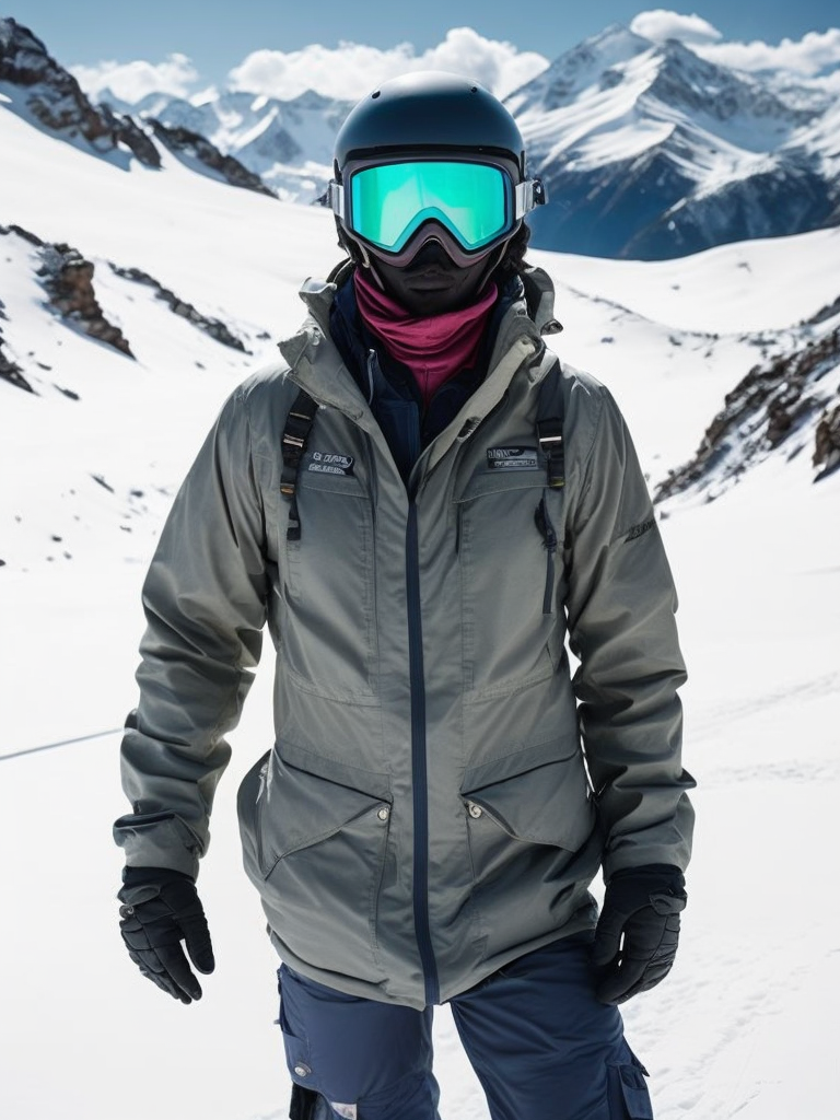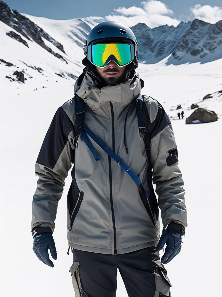 A man in a snowboard suit with snowboard goggles, against the backdrop of snow-capped mountains, high quality details