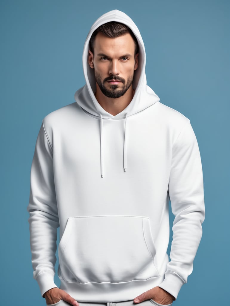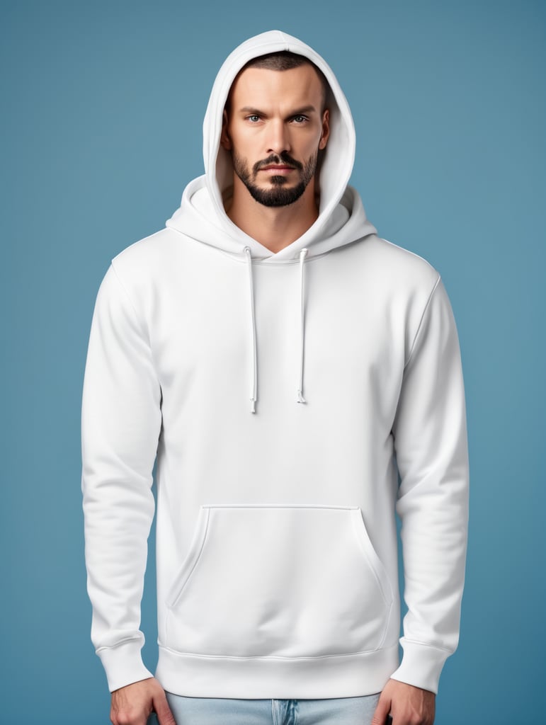 a man wearing blank white hoodie, isolated, blue background, style of Miles Aldridge, mockup, mock up