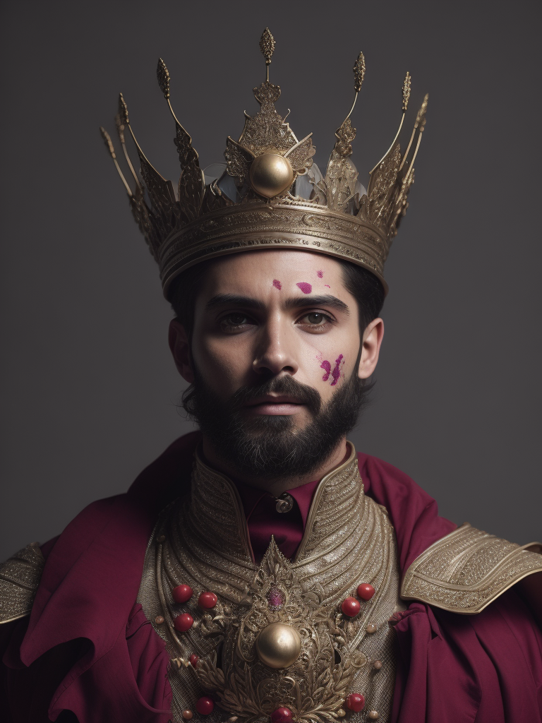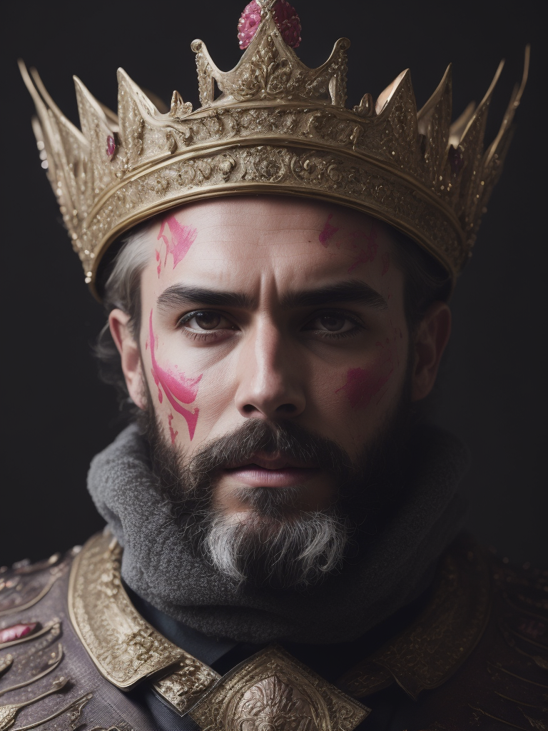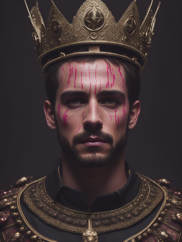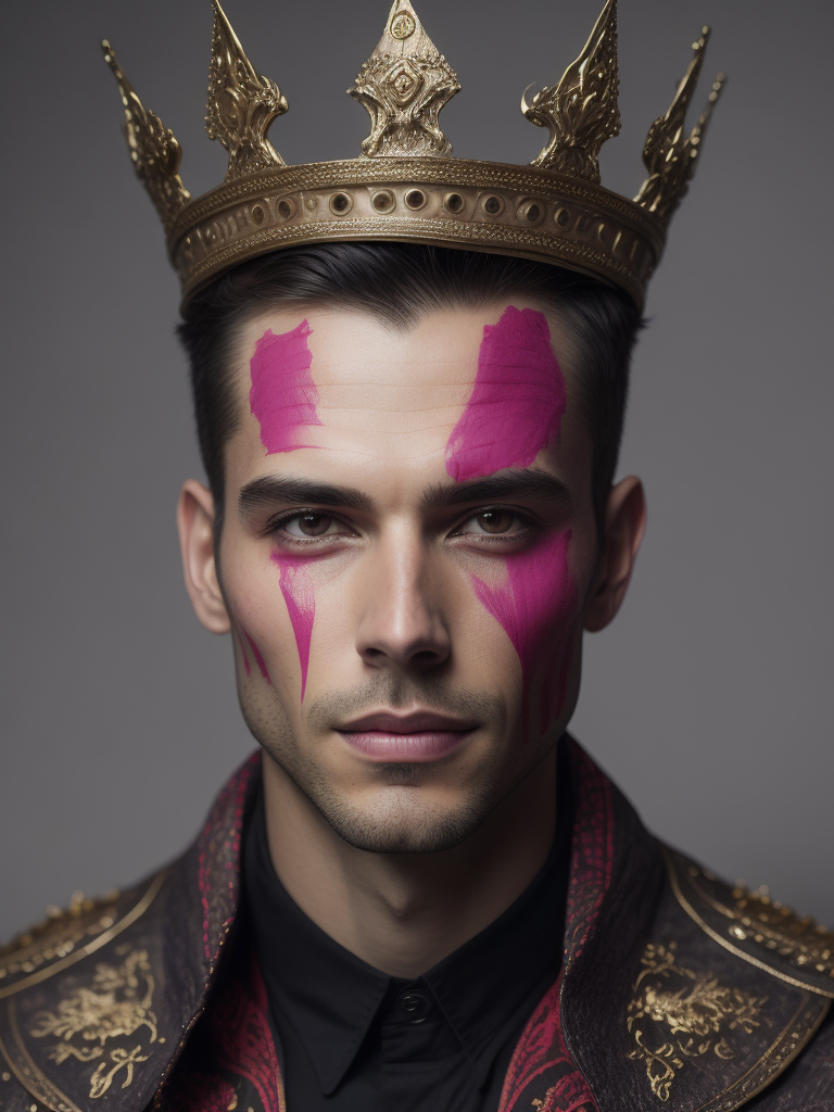 a man wearing a crown with pink paint on his face and a crown on his head by Alejandro Jodorowskyhttps://lumenor.ai/terms-of-service/https://lumenor.ai/ai-generated-images-gallery/h2gDYJTfEz/lumenor AIlumenor AI