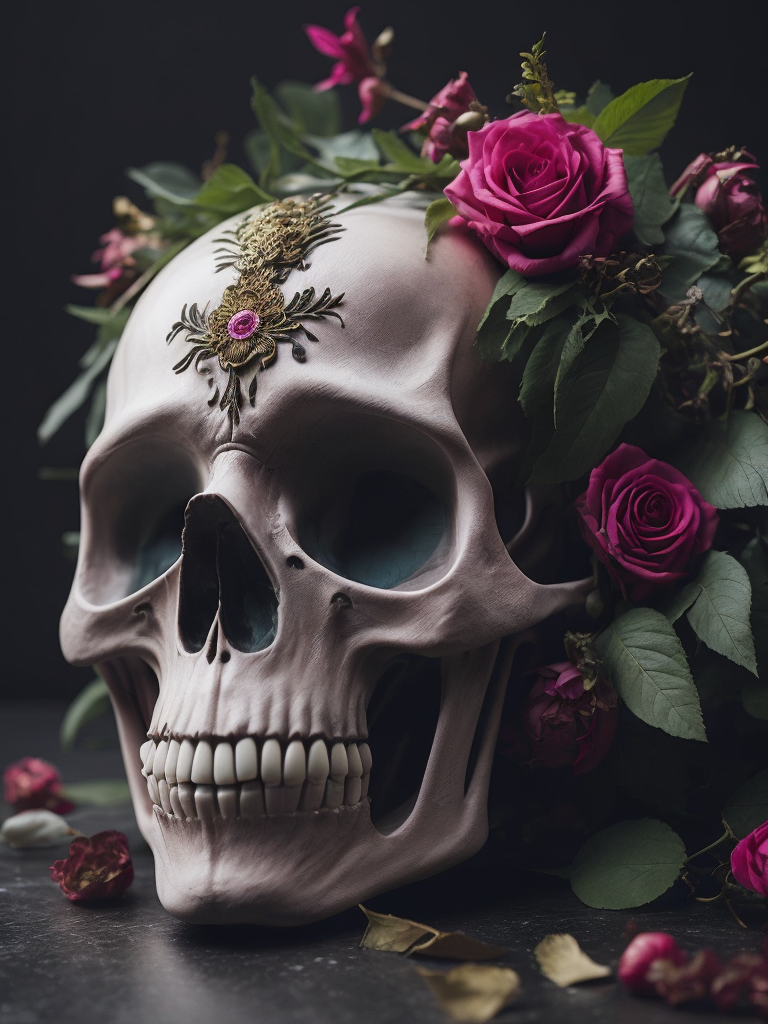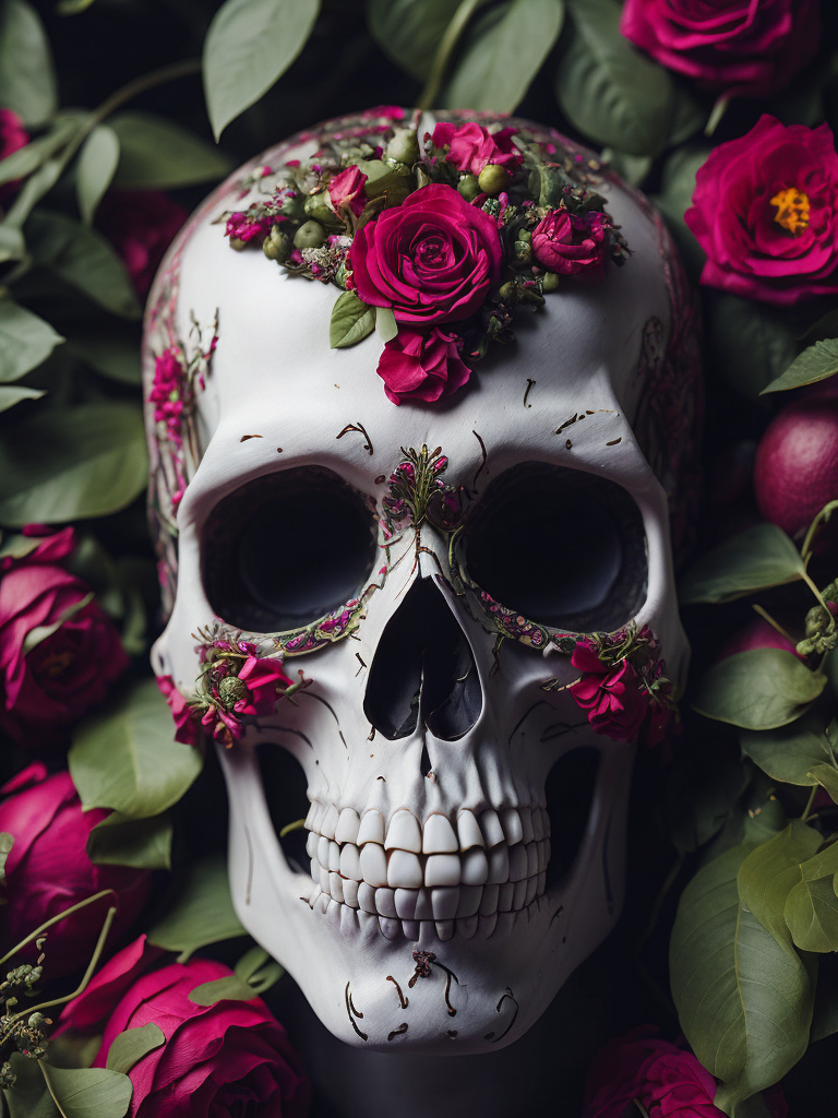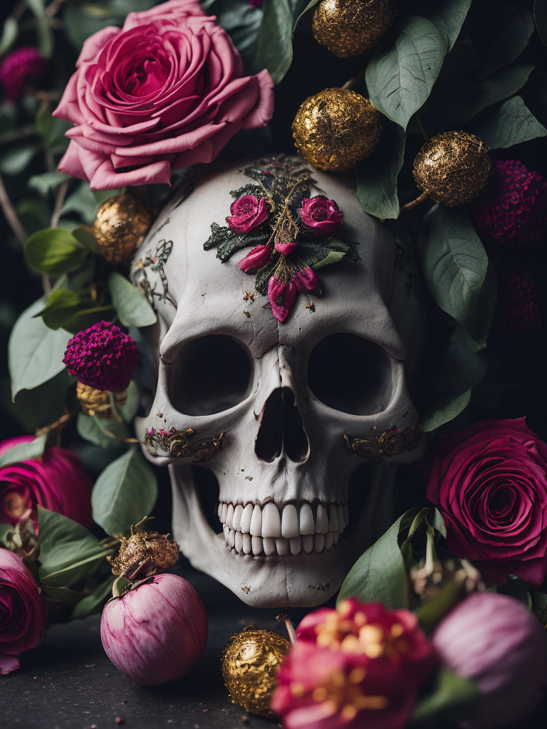 Mexican skull calavera, surrounded by poetic ornamental elements such as fruits, flowers, garlands of lights and native plants, colors pink, green, gold and blackhttps://lumenor.ai/terms-of-service/https://lumenor.ai/ai-generated-images-gallery/hpJAebhUyW/lumenor AIlumenor AI