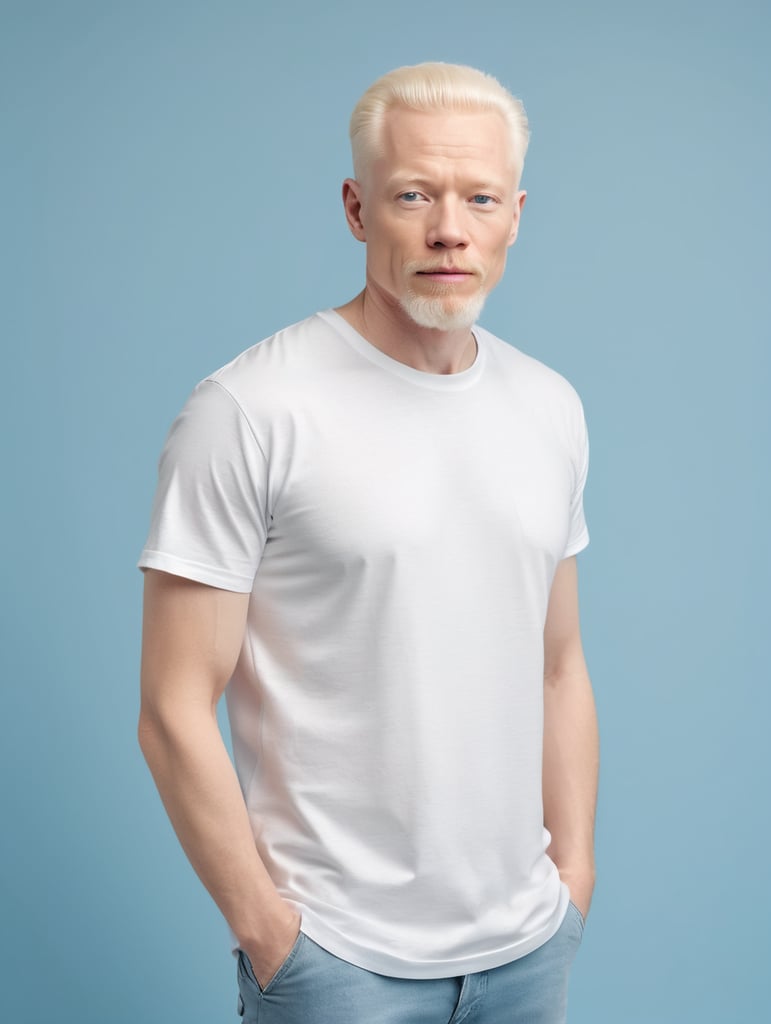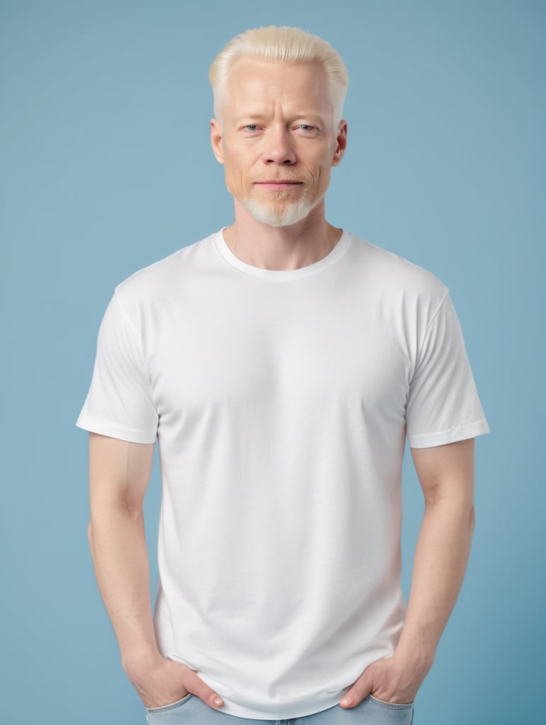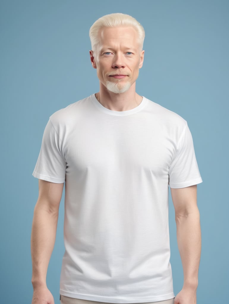 A middle-aged albino man wearing a white T-shirt, isolated, blue background, mockup, mock uphttps://lumenor.ai/terms-of-service/https://lumenor.ai/ai-generated-images-gallery/hXeA2qlmm7/lumenor AIlumenor AI