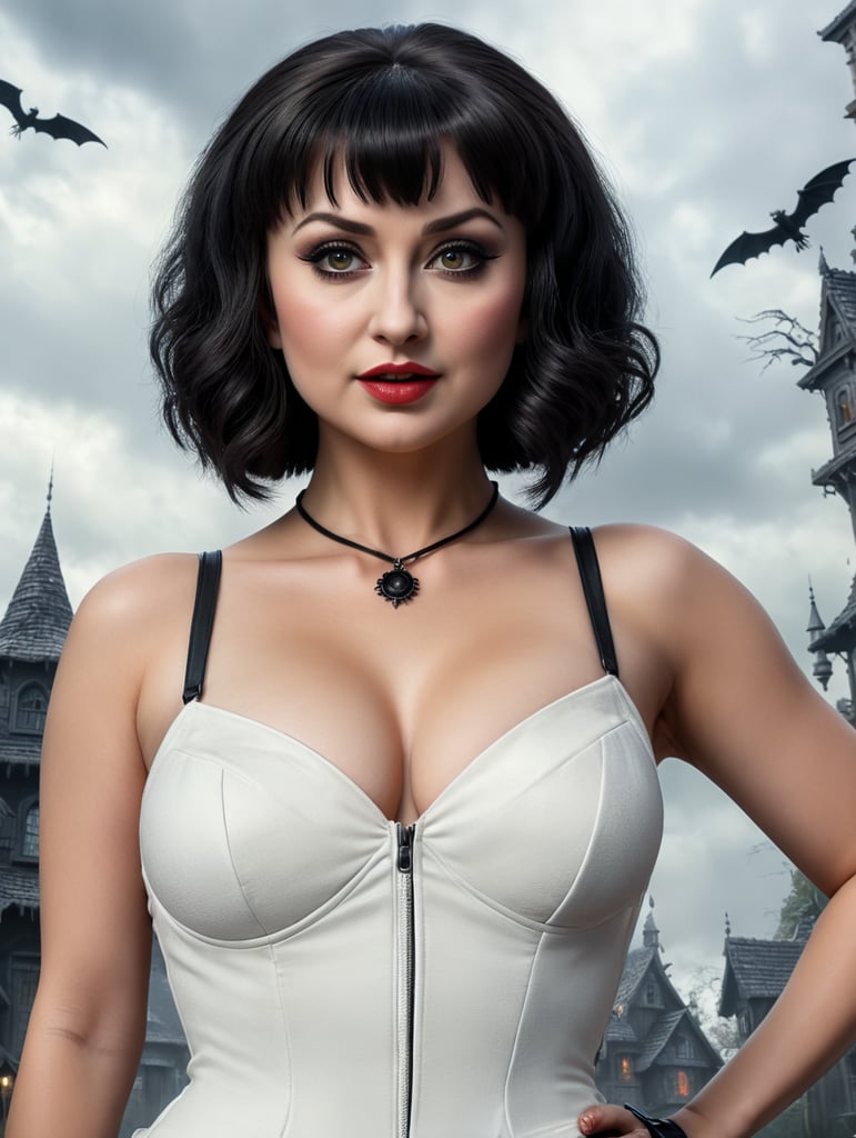 - milana vayntrub elvira mini gru haunted house photorealistic photo halloween costume actor actress cosplay spooky ambiance