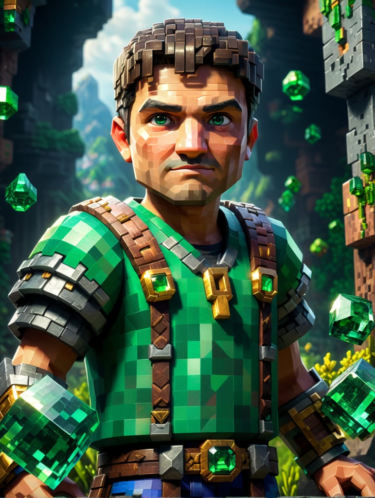 Minecraft character villager which trading with emeralds, pixel style, blocks, vibrant colors, clear details
