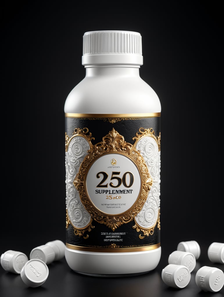 Mockup of a 250cc white supplement bottle, side view, in the center of the image