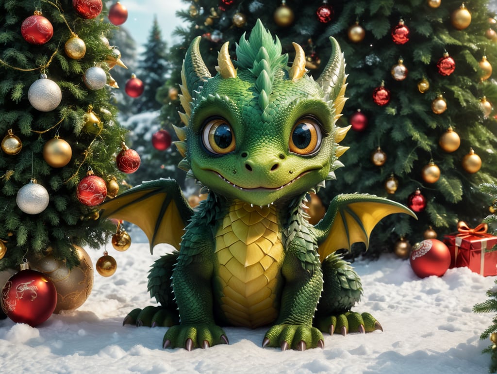 cartoon green dragon, cute, fluffy, big eyes, sitting in the snow, next to a Christmas tree decorated with Christmas decorations, bright garlands
