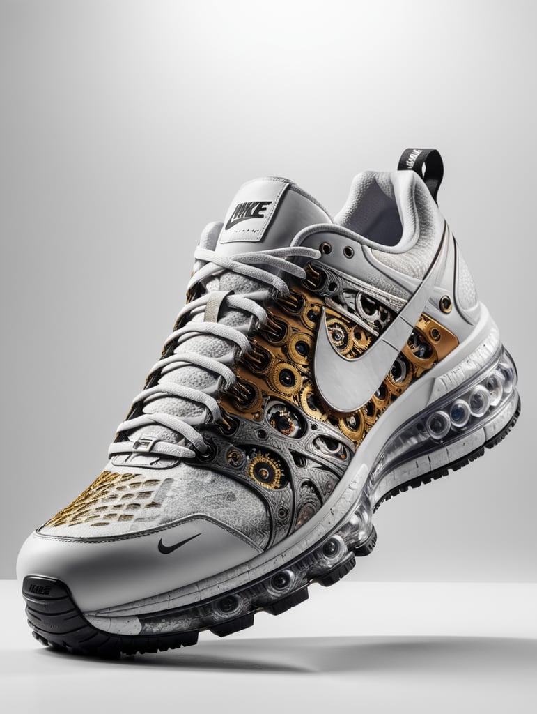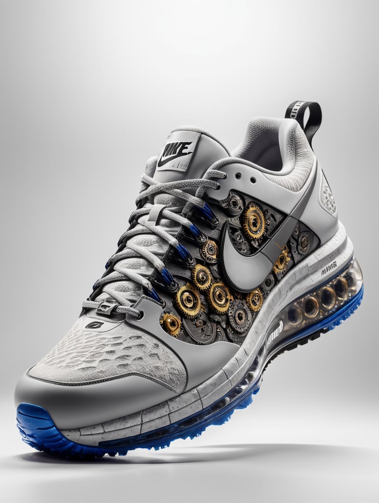 Nike sneakers made out gears, wires, mechanical, electronics, pcb, hyper-realis, futurist, stunning unreal engine render, product photography 8k, hyper-realistic. surrealism