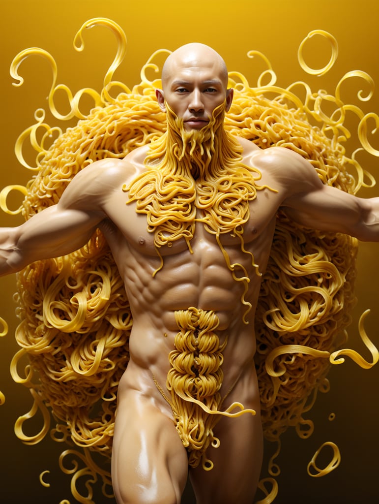 noodles taking the shape of human body running on yellow background, high quality photography, 4k, octane render, professional photography, highly detailed,