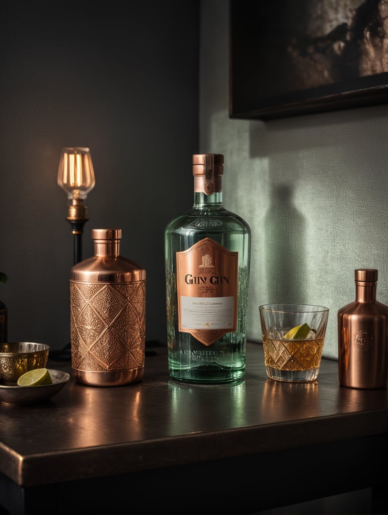 - gin bottle copper aesthetic dramatic light alcohol beverage drink alcohol bottle barware liquor whiskey set