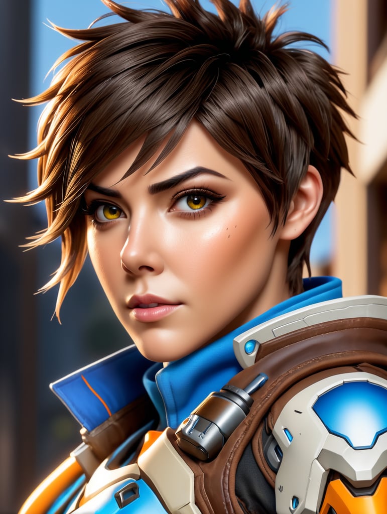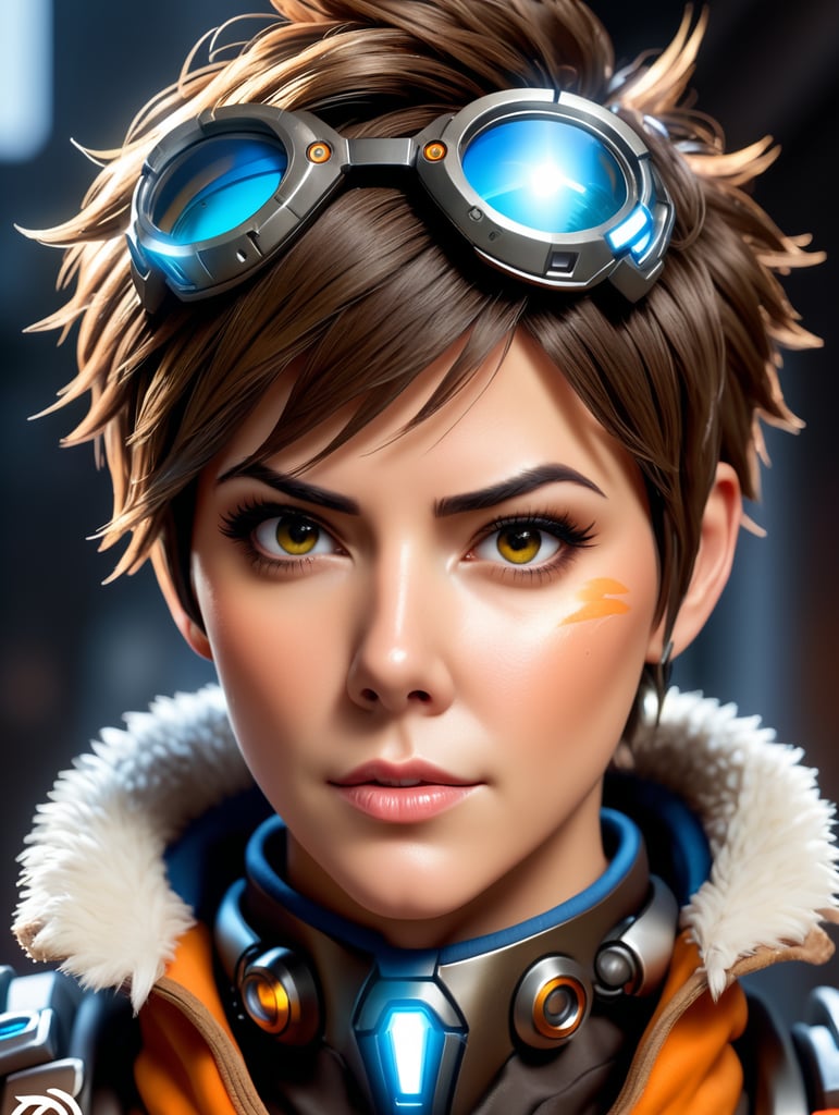 - overwatch tracer real life portrayal photorealistic art professional photography portraiture high quality rendering precision details digital artwork gaming character fan art