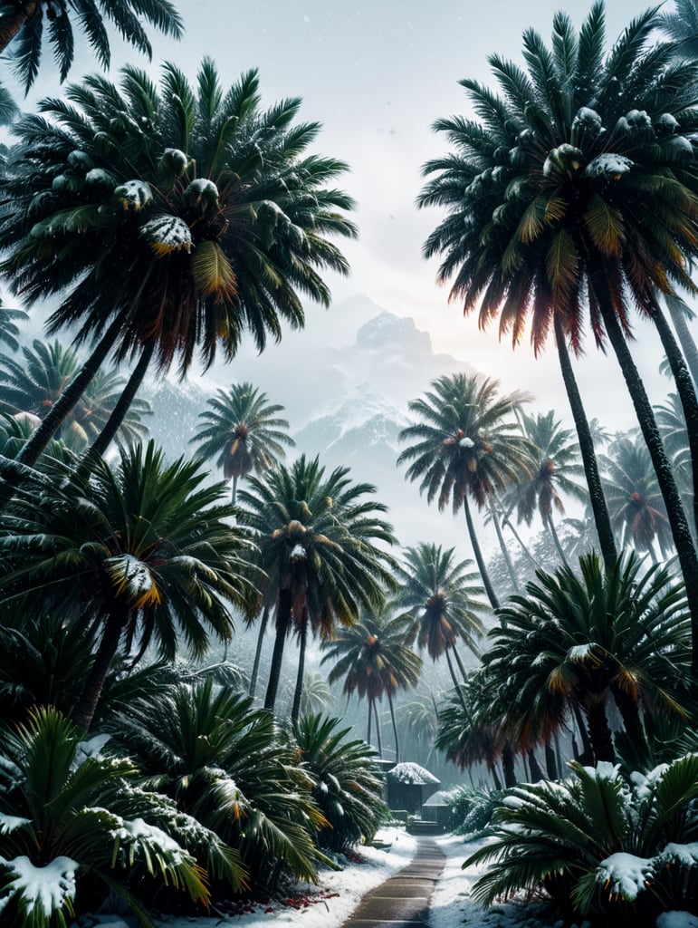 - palm trees snowy palm trees winter palm trees tropical snowscapes palm trees in snow snow covered palms unusual winter scenery palm trees with snowy leaves unexpected snowy paradise winter surprises in the tropics