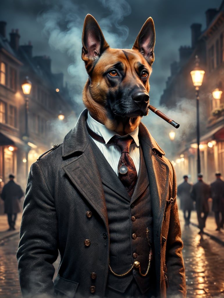 - belgian malinois sherlock dog cosplay smoking pipe thoughts detective dog sherlock holmes canine night street blur thinking pooch malinois mystery dressed up doggo canine detective