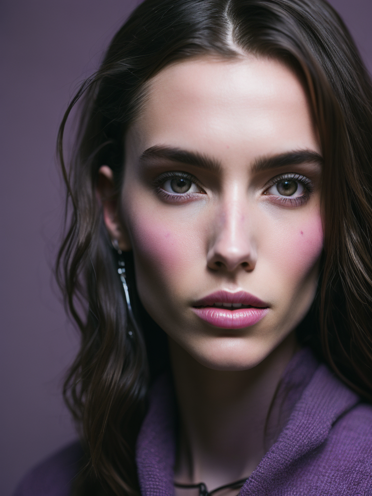 A photo close-up of a beautiful black haired woman with freckles, fashion editorial, studio photography, magazine photography, wearing pink and purple colors, blurry background