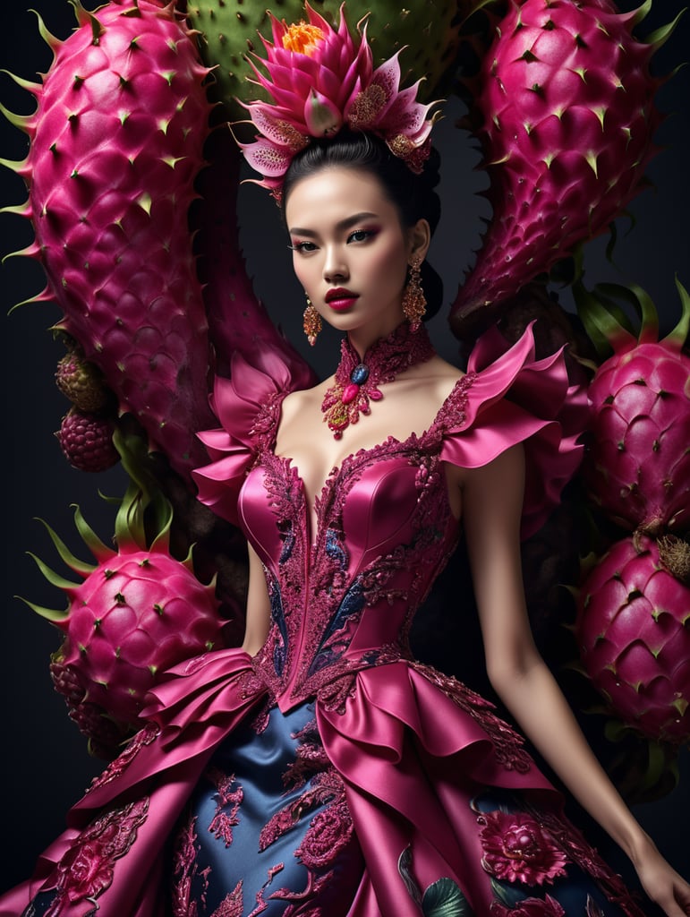 - fashion model luxury dress dragon fruit inspiration official dior editorial photoshoot highly detailed fashion photography runway fashion couture design high fashion