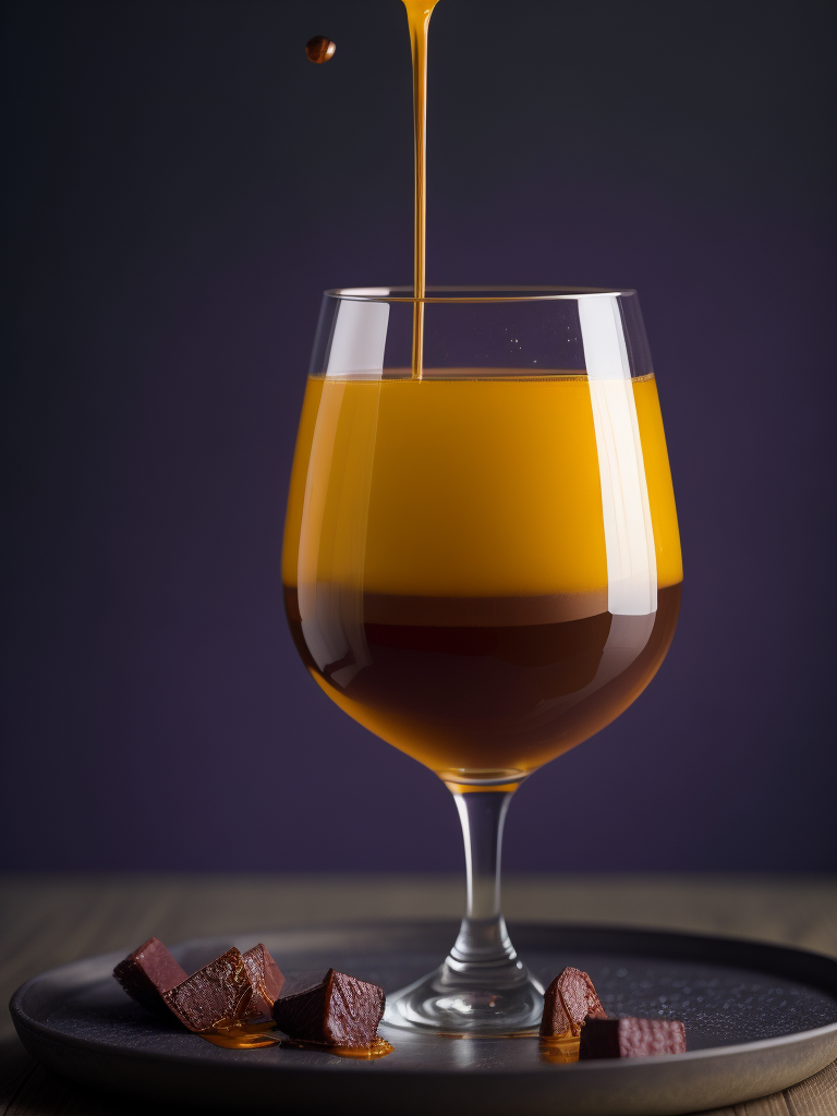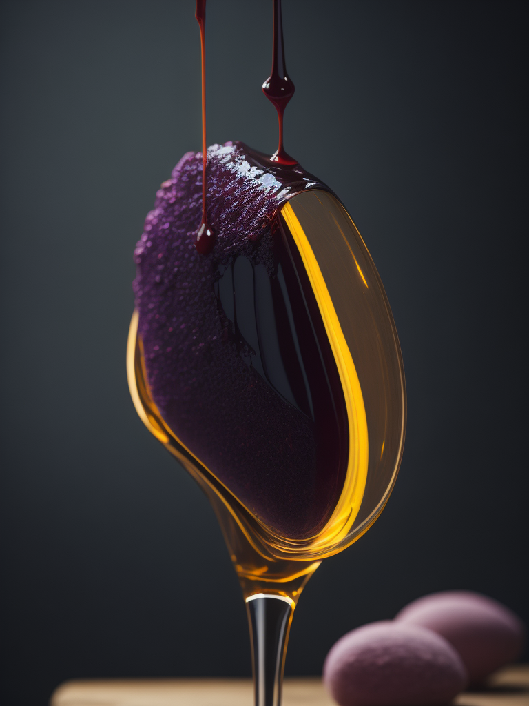 a photo of honey from the wooden spoon going down on the melted chocolate, deep purple background, deep atmosphere