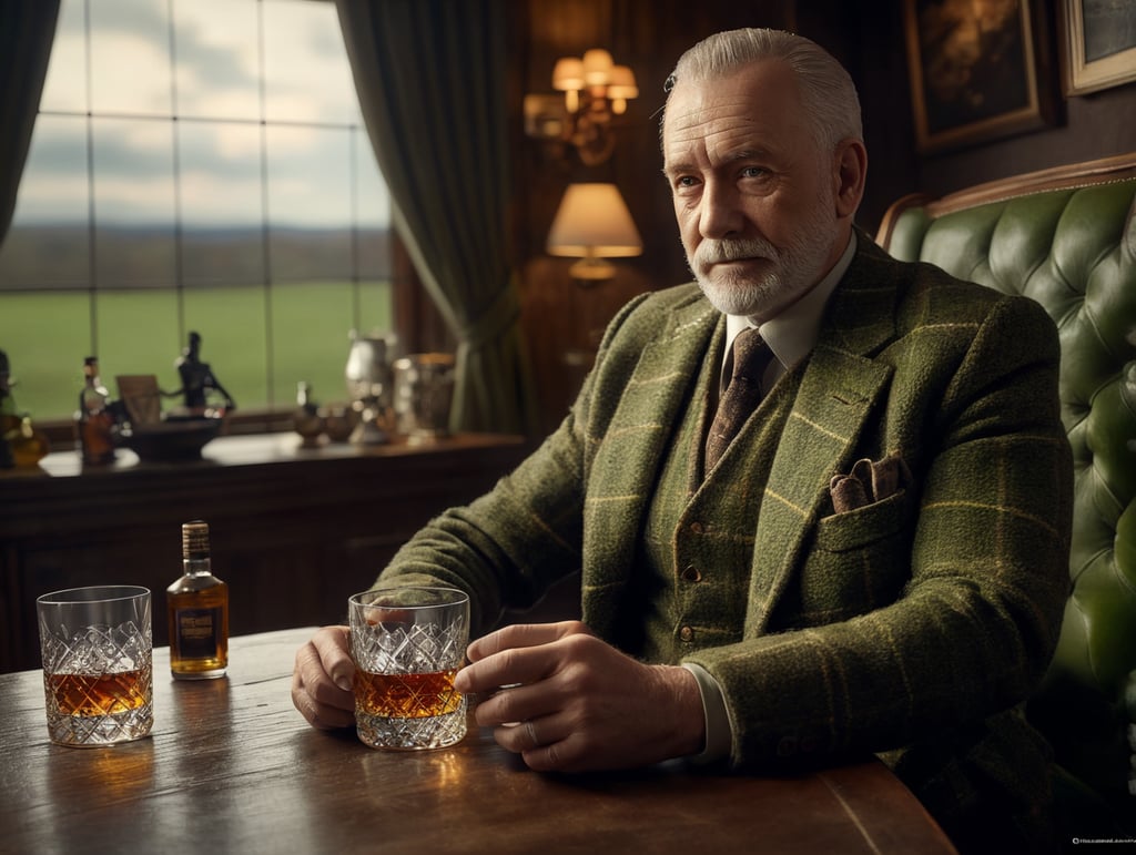 - 50mm photography shallow depth of field hand holding whisky in a glass green tartan furnishings open window ambiance hard shadows middle aged man tweed jacket country lounge setting 8k high definition film camera