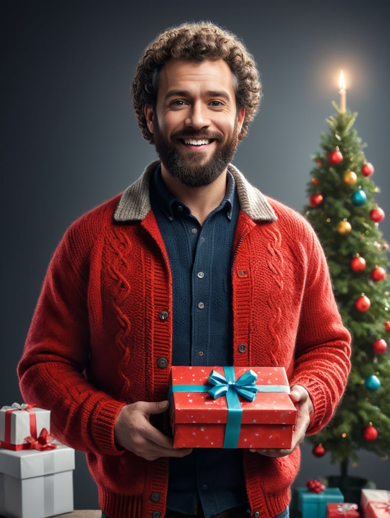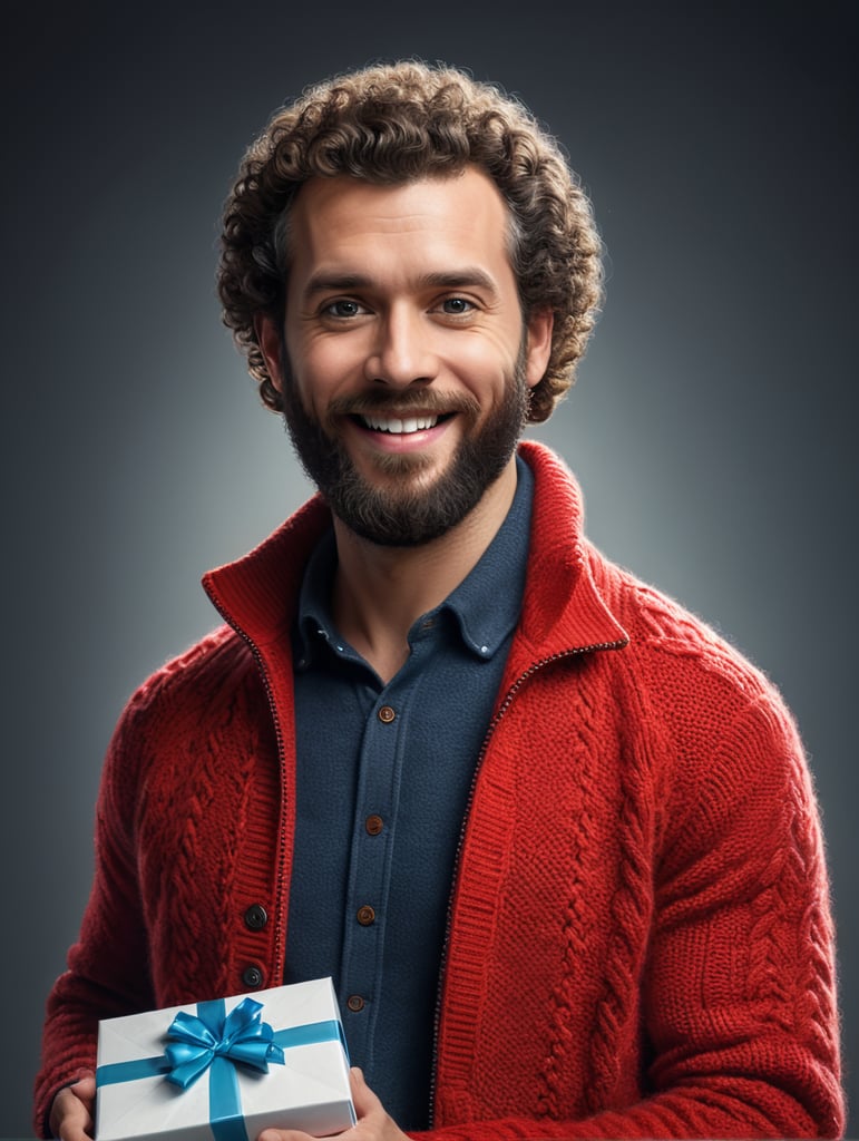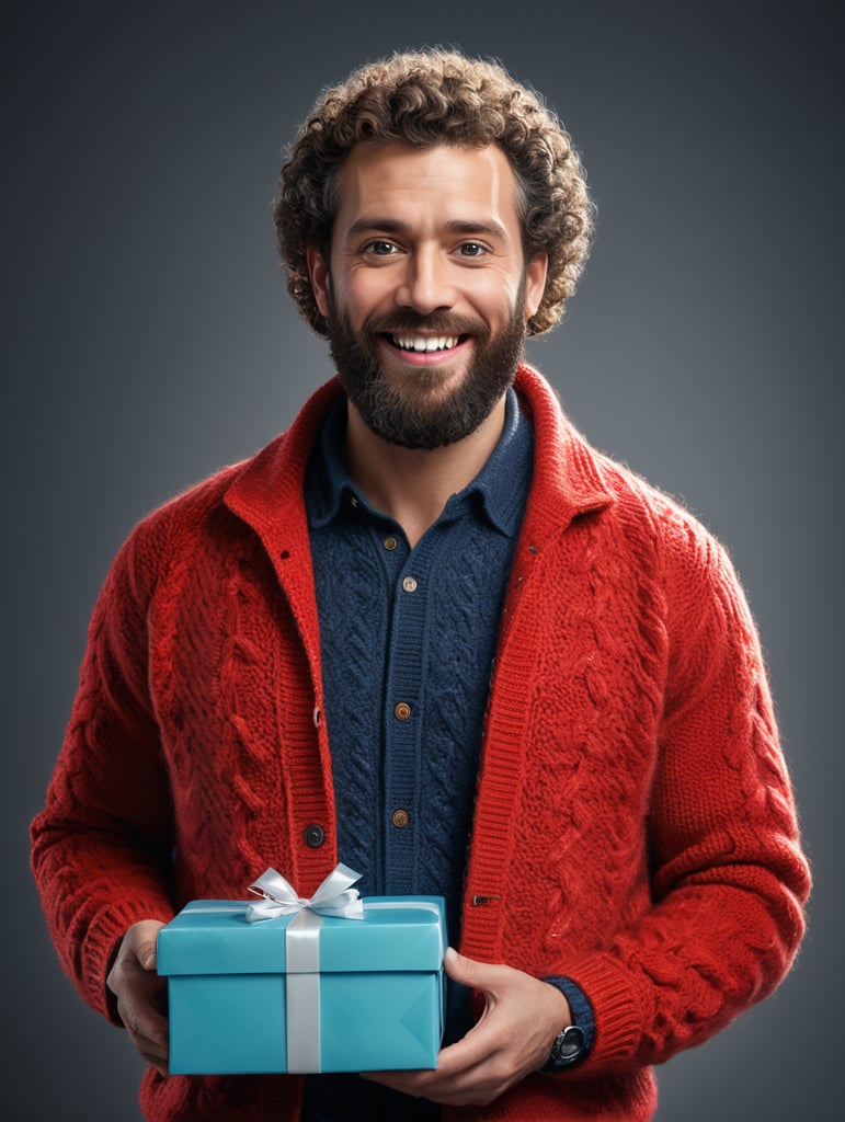 - bearded man curly hair red knitted jacket gift box happy birthday images spring time portrait front camera celebration festive