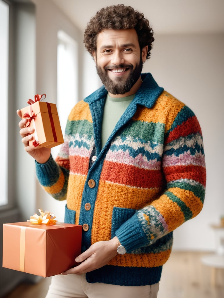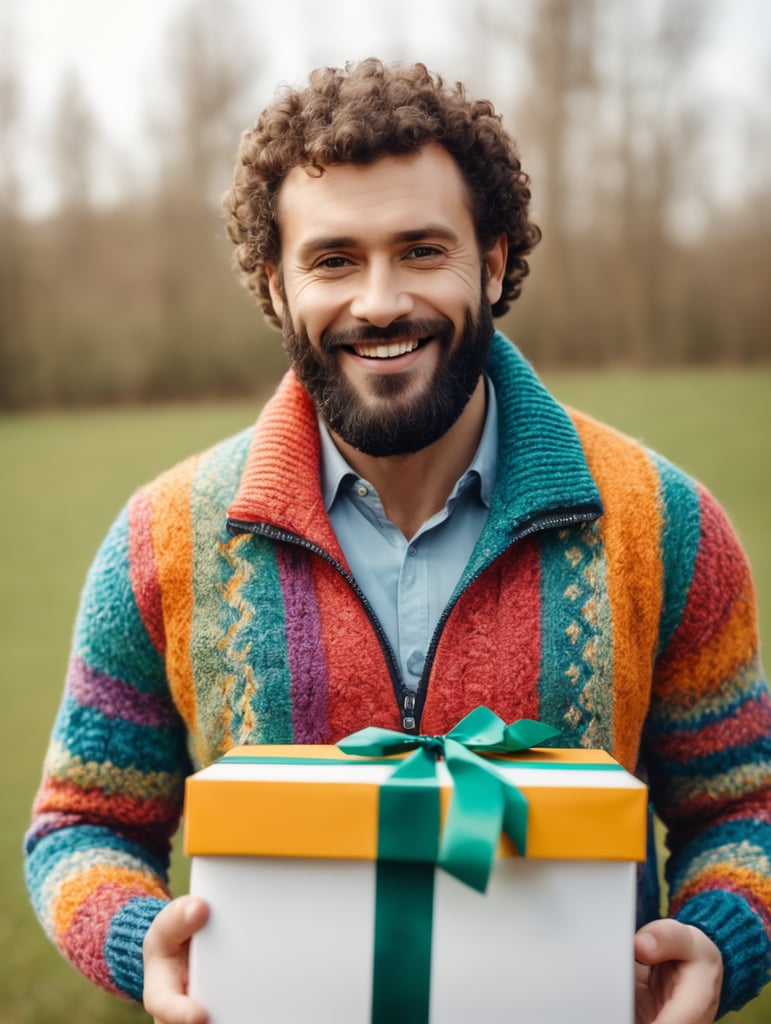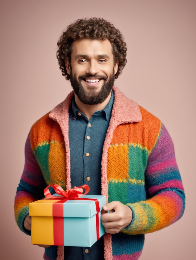 portrait of a bearded curly man wearing coloured knitted jacket, stands front camera with gift box his hand, happy birthday images, spring timehttps://lumenor.ai/terms-of-service/https://lumenor.ai/ai-generated-images-gallery/eedsMjkGx/lumenor AIlumenor AI