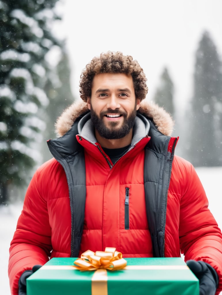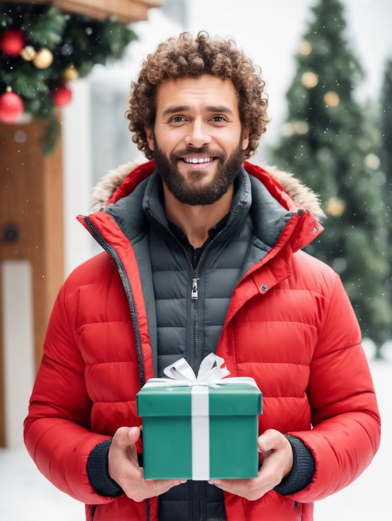 portrait of a bearded curly man wearing red puffer jacket, stands front camera with gift box his hand, snowy weather, Christmas timehttps://lumenor.ai/terms-of-service/https://lumenor.ai/ai-generated-images-gallery/hsLWZzzCxo/lumenor AIlumenor AI