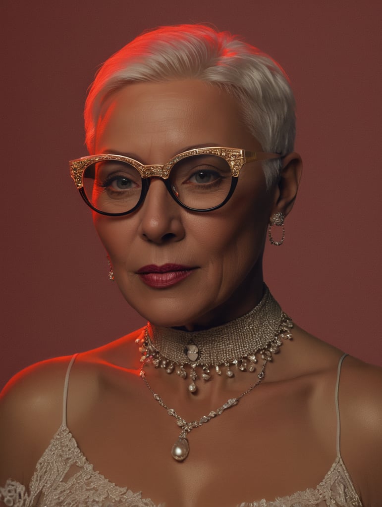 A portrait of a beautiful stylish older woman with white platinum short hair and big glasses, glamorous Hollywood portraits, highly realistic, daz3d, women designers, high resolution, very fashionable, colorful, dress as young woman