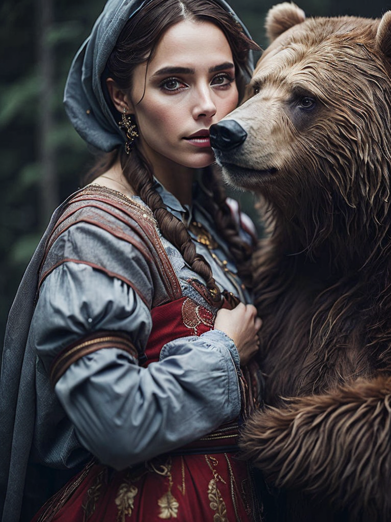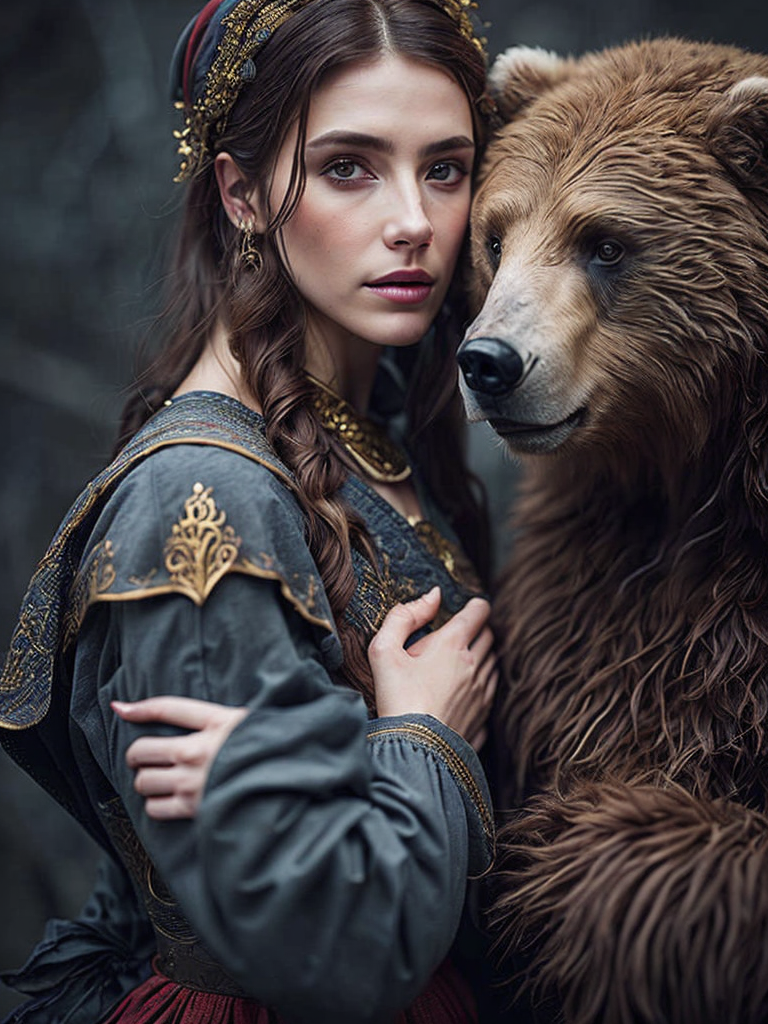 Portrait of a Beautiful women from Russian fairytale wearing traditional costume hugging a bearhttps://lumenor.ai/terms-of-service/https://lumenor.ai/ai-generated-images-gallery/hmFTc91XTE/lumenor AIlumenor AI