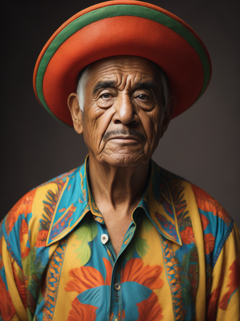 Portrait of a big wrinkled colorful Mexican in a sambrero, a young man, a multi-colored shirt, a criminal man, a bad face