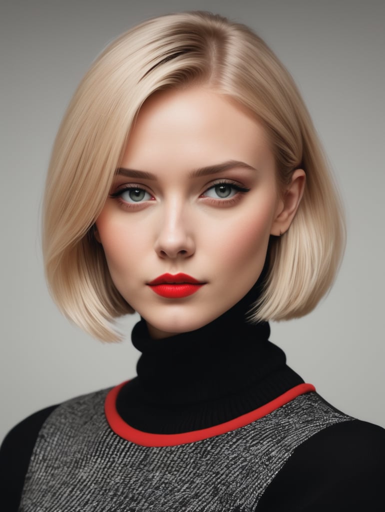 - blonde girl bob style hair black turtleneck black and white colors red bright accents wolfgang weingart style fashion portrait modern hairstyle bold color palette contemporary fashion