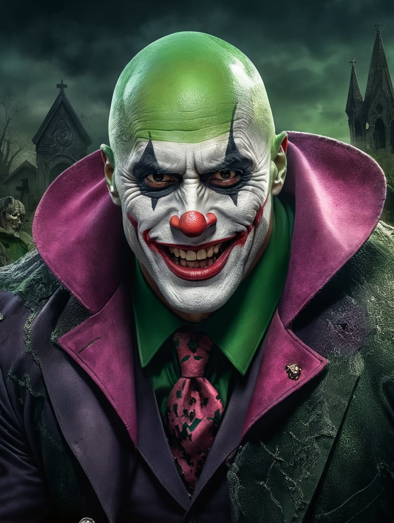 - dwayne johnson joker costume scary makeup dark atmosphere vintage style green and pink colors highly detailed photo professional photo old creepy cemetery contrasting light