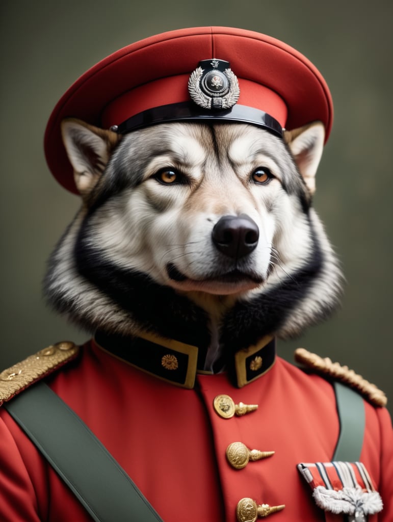 A portrait of a eurasian german wolfdog in a grren twentyteenth century chinese Army Brigadier uniform