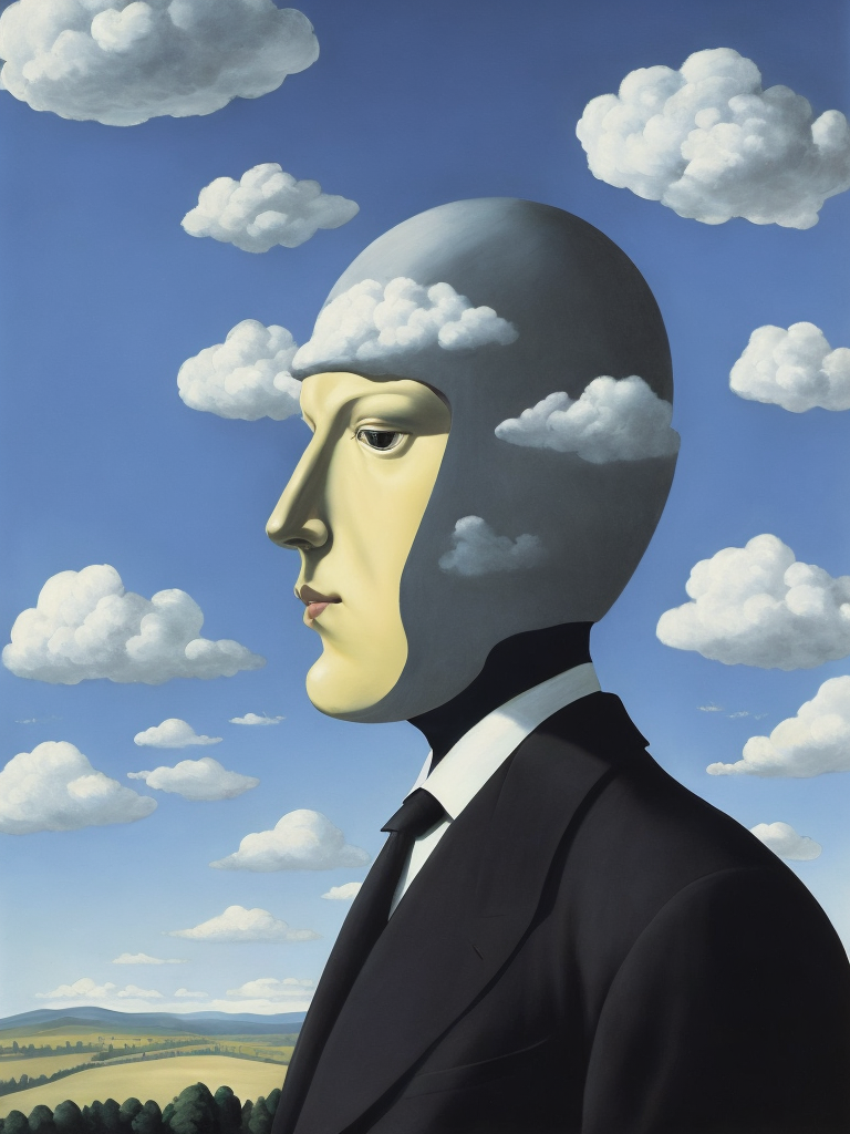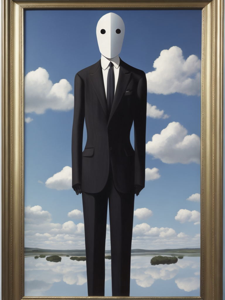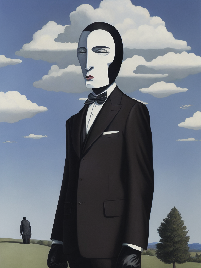 - faceless reflection chrome head man suit and black gloves clouds and nature landscape rene magritte detailed painting distance centered hd (high definition) high detail