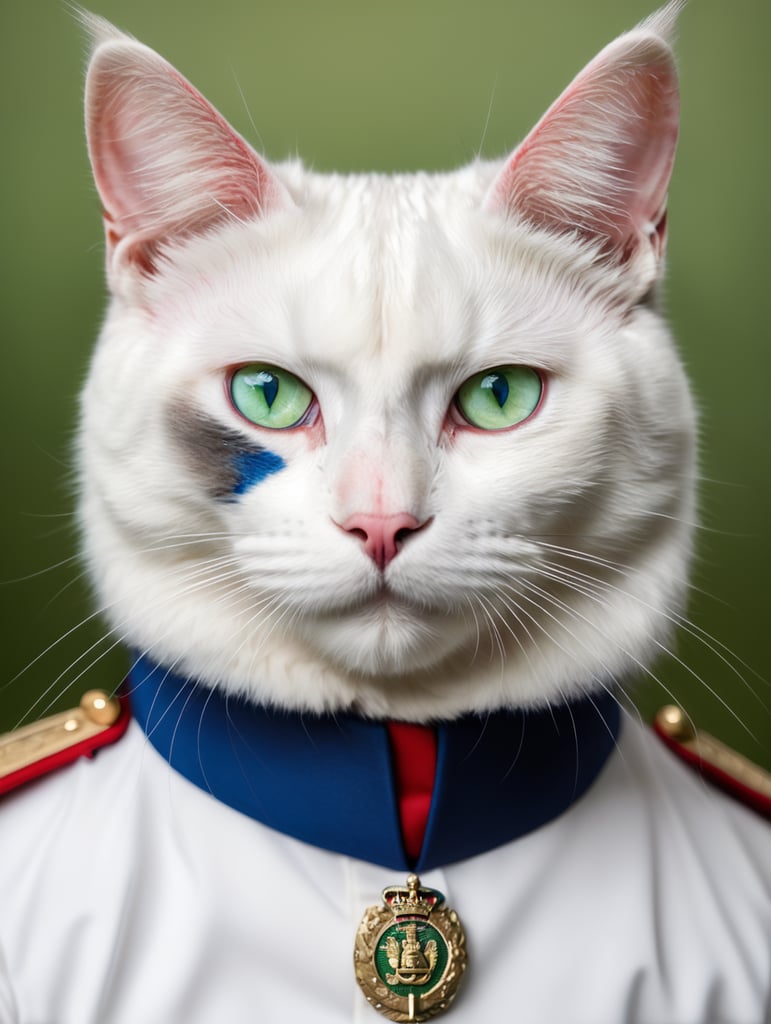 A portrait of a gentleman white male cat with scarred ears. a green eye and a blue eye, staring nobley into the middle distance, wearing a red British Army uniform.https://lumenor.ai/terms-of-service/https://lumenor.ai/ai-generated-images-gallery/eY0te0Wzw/lumenor AIlumenor AI