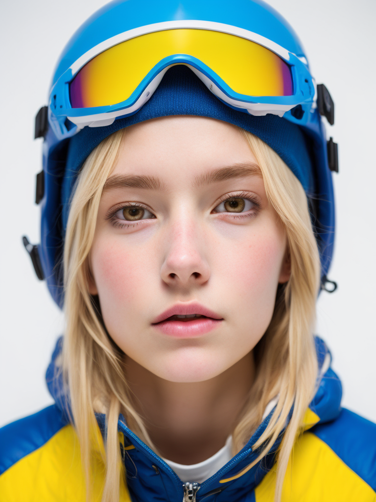 - portrait girl yellow sport hat colorful goggles snowboarding blue jacket blond hair white background winter sports outdoor activity